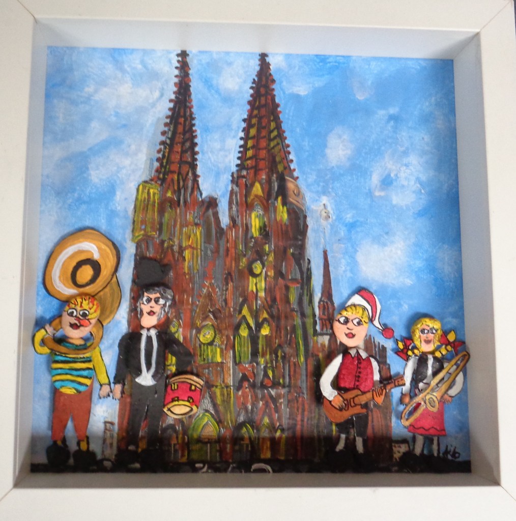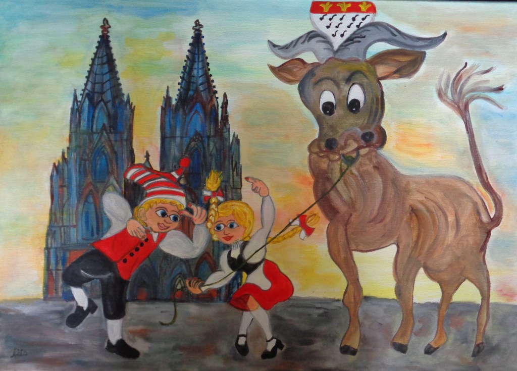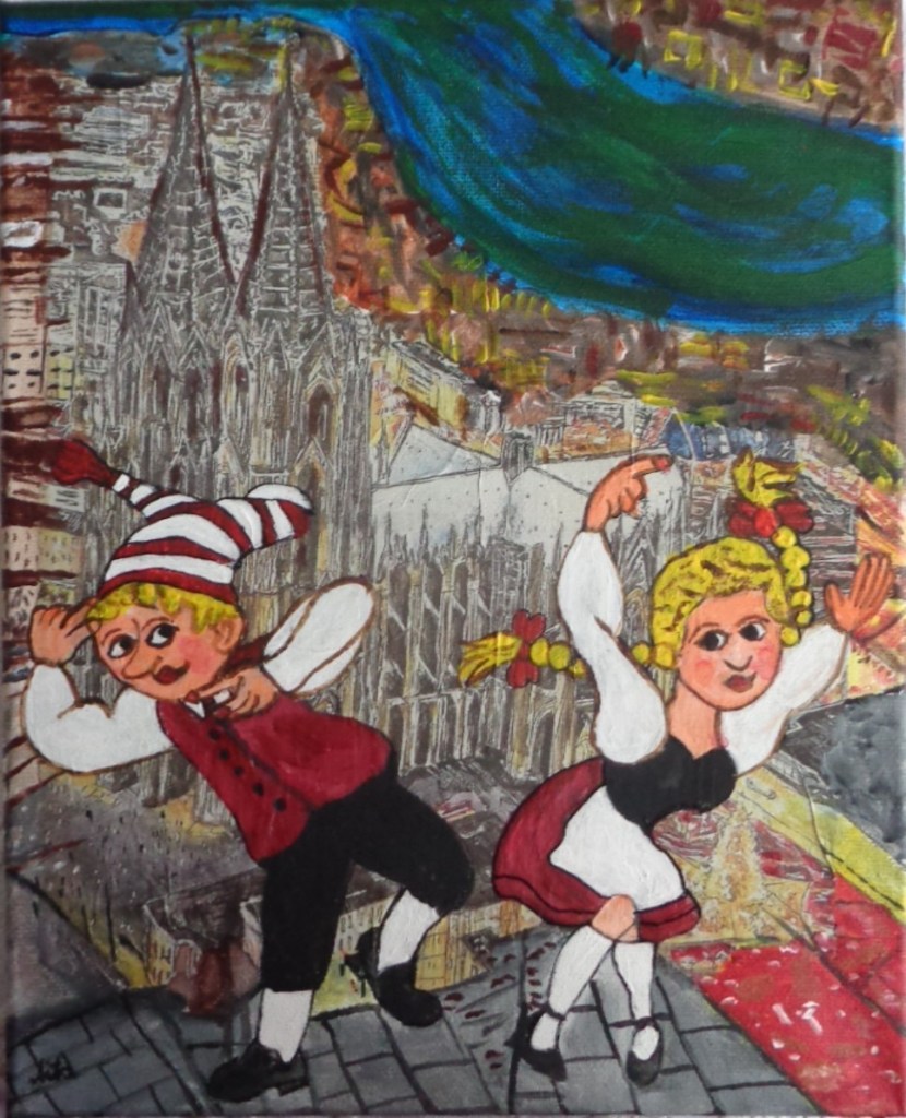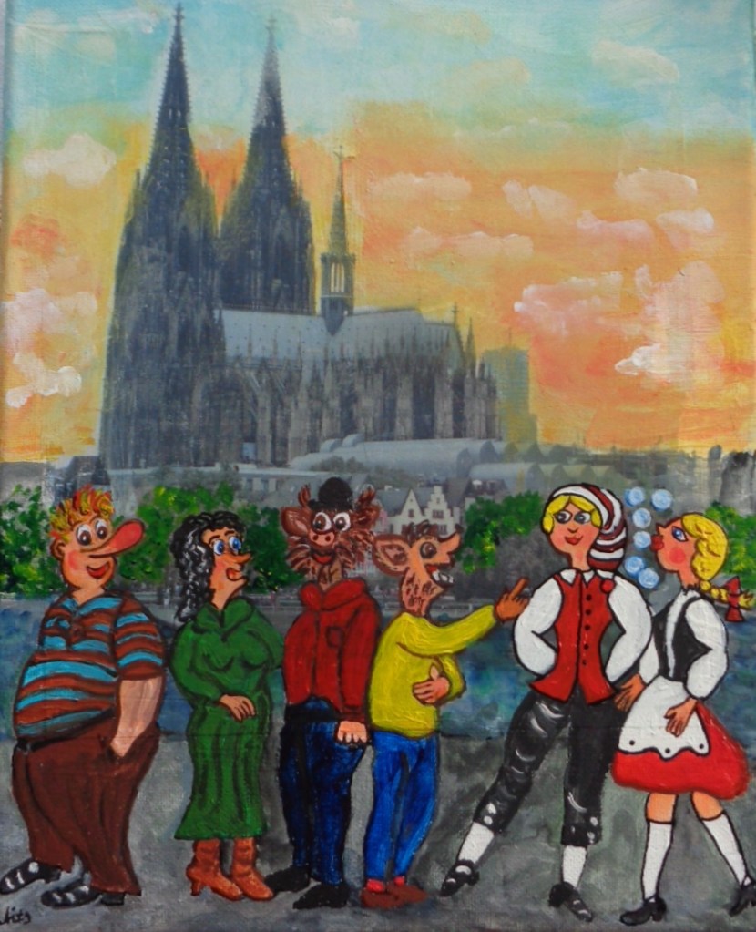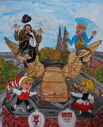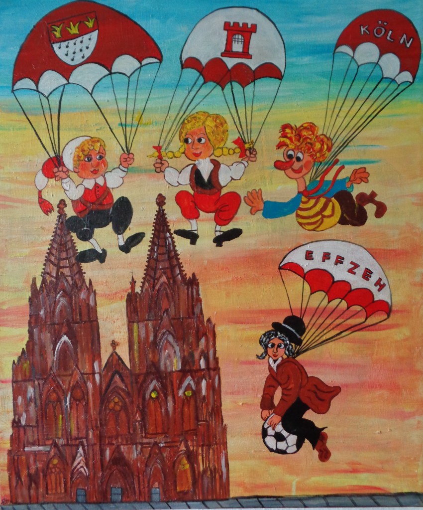 Kölner Tanzpaar 30×40 120 €*Puppenspieler 40×50 200 €*Hänneschen auf Schaukel 20x20x *Angler 30×40 *Luftblasen vor Dom 30×40 120 €*Herzen über Mond 40×70 *Skyline Köln 40×60 240 €*Wir bringen den Stein ins Rollen 50×70 370 € * Kölner kommen aus dem Weltall 40×50 *Gründung Kölns 80×100 *Auf dem Buddelschiff mit der Goethe 60×80 * Der geflügelte Ford in Köln 50×70 *Ich bin schon mal ausgestiegen 30×40 120 € *Seifenblasen vor Köln 20×20 *Insel der Seligen 40×50 200 € Ostfriesen auf Wildgänsen 50×70 350 €Hertie Abriss Köln 40×60 200 € *Einräder über Domspitzen 50×70 350 € *Lavendel 30×40 120 €*Fallschirme über dem Stadion 18×23,5 *Baum des Lebens 30×40 120€