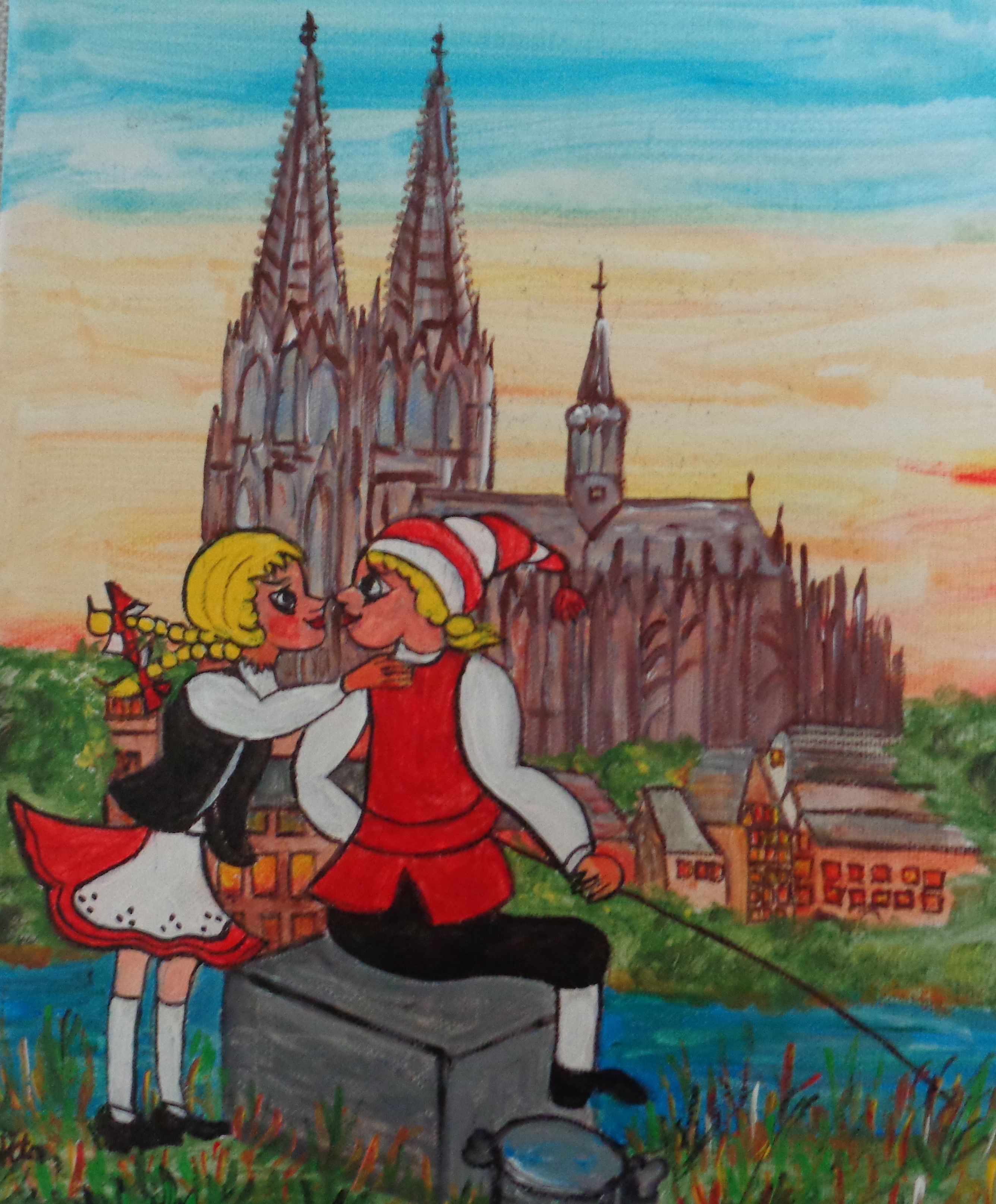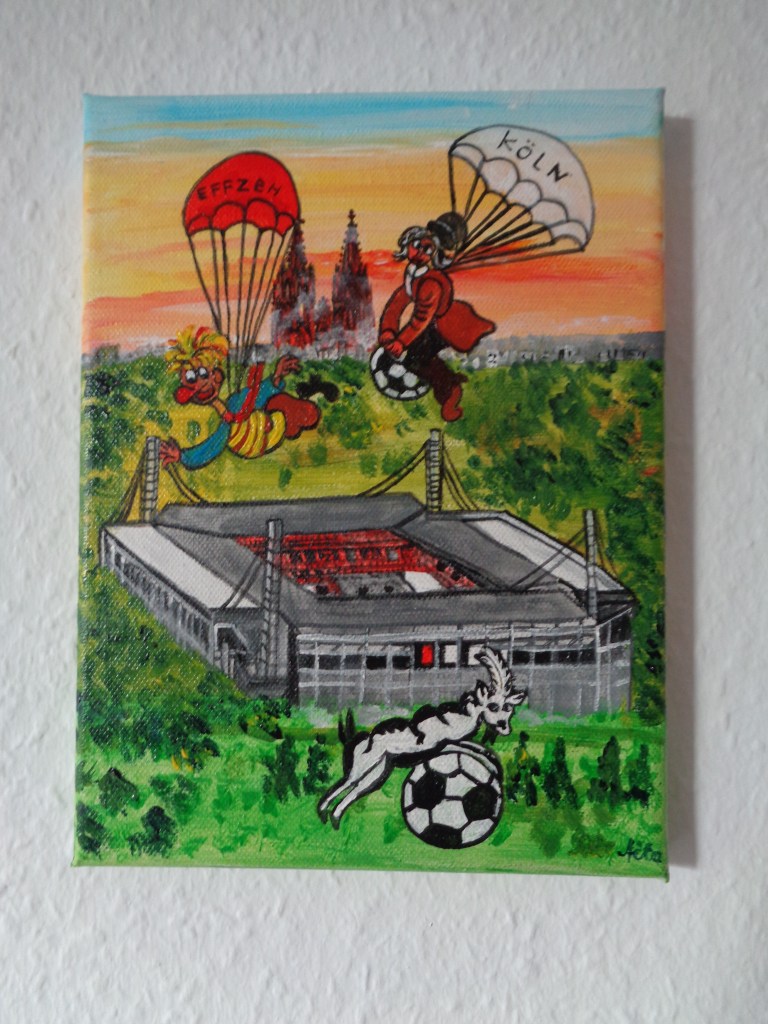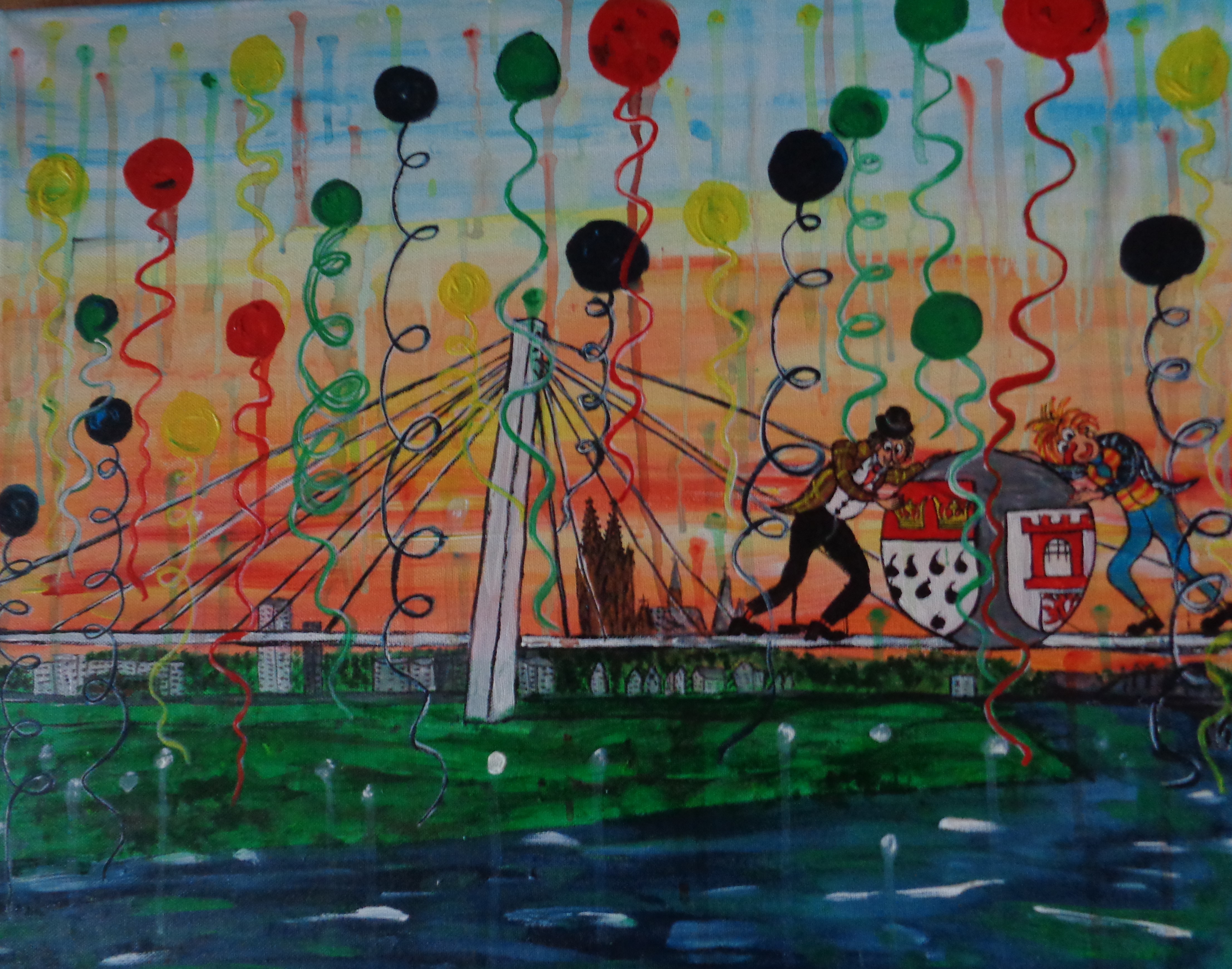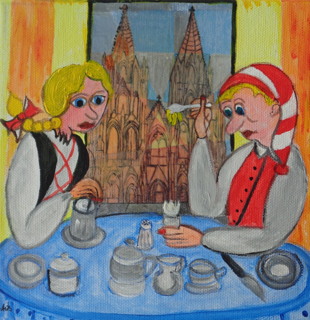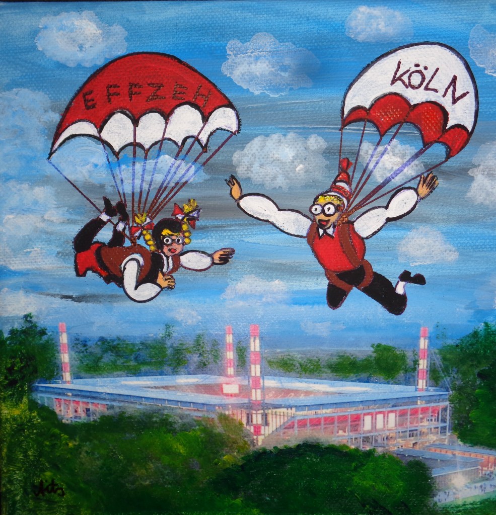 Kölner Tanzpaar 30×40 120 €*Puppenspieler 40×50 200 €*Hänneschen auf Schaukel 20x20x *Angler 30×40 *Luftblasen vor Dom 30×40 120 €*Herzen über Mond 40×70 *Skyline Köln 40×60 240 €*Wir bringen den Stein ins Rollen 50×70 370 € * Kölner kommen aus dem Weltall 40×50 *Gründung Kölns 80×100 *Auf dem Buddelschiff mit der Goethe 60×80 * Der geflügelte Ford in Köln 50×70 *Ich bin schon mal ausgestiegen 30×40 120 € *Seifenblasen vor Köln 20×20 *Insel der Seligen 40×50 200 € Ostfriesen auf Wildgänsen 50×70 350 €Hertie Abriss Köln 40×60 200 € *Einräder über Domspitzen 50×70 350 € *Lavendel 30×40 120 €*Fallschirme über dem Stadion 18×23,5 *Baum des Lebens 30×40 120€