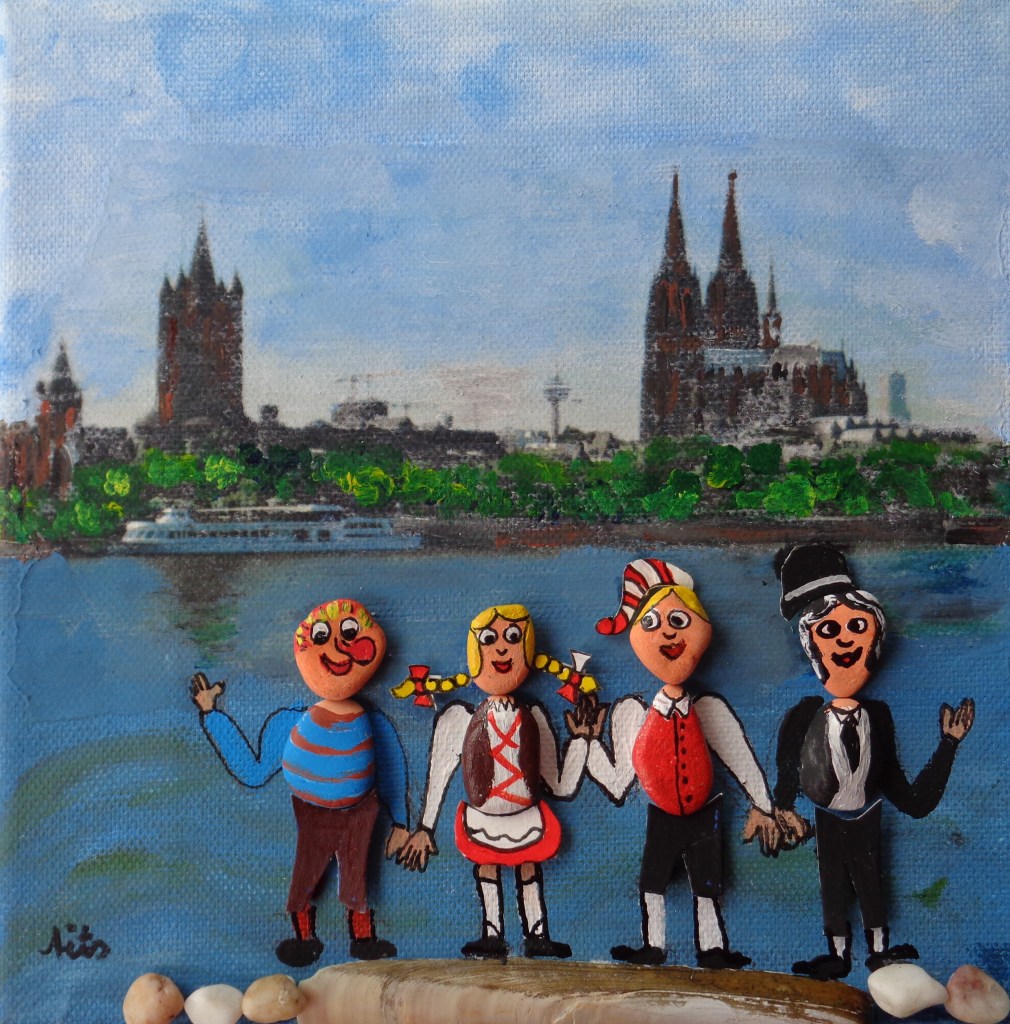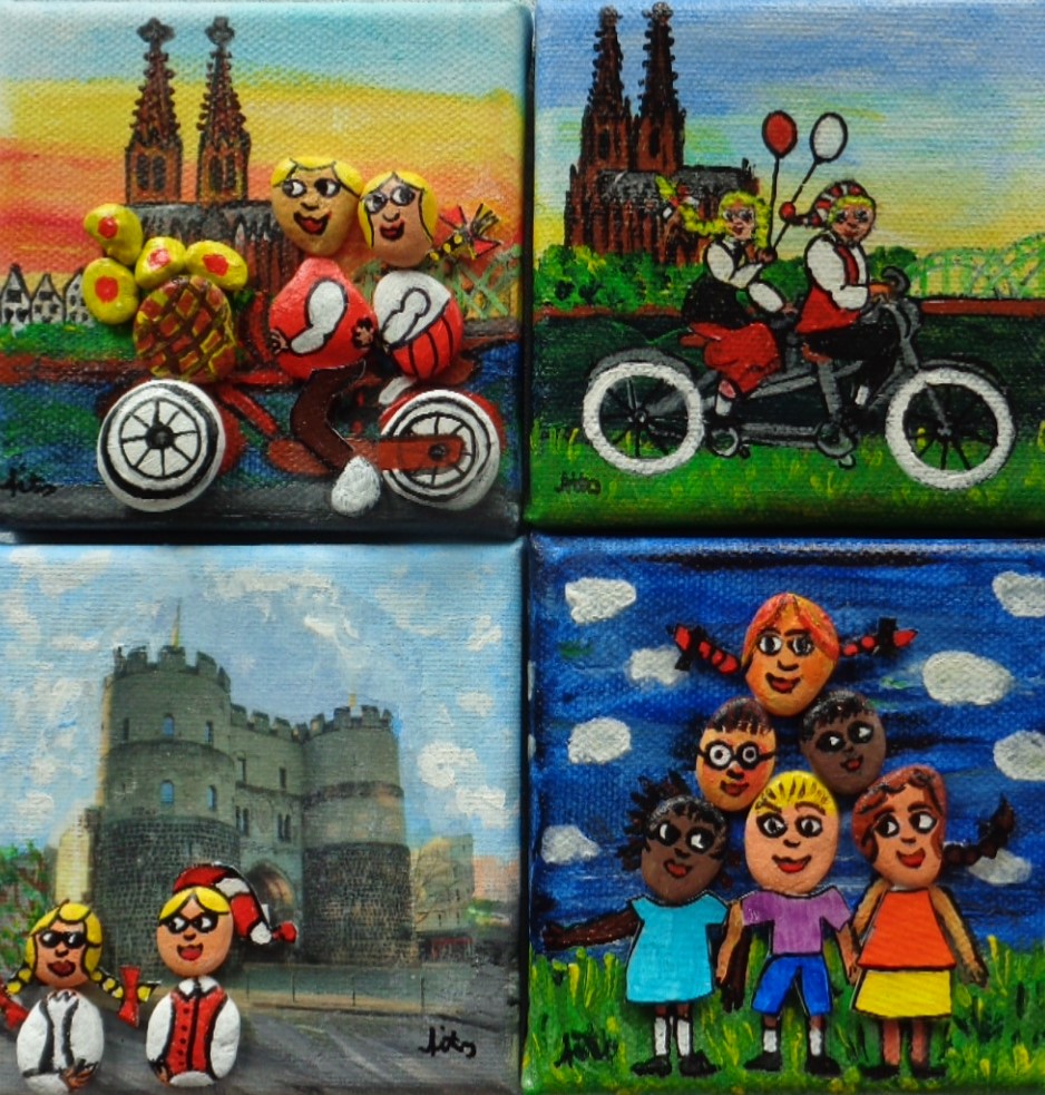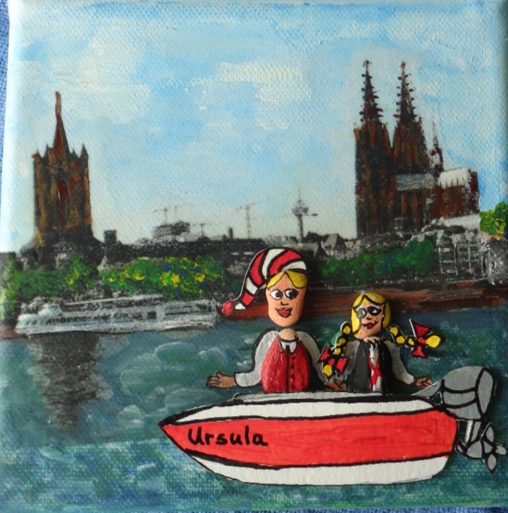 Alles in der Schwebe Acryl auf Leinen bemalte Rheinkiesel 10×10 39,- €Boot Ursula Acryl auf Leinwand 3D 15×15 29,- €Frosch und Schnecke Acryl auf Leinwand Mixed Media 20×20 39,- €Handbemalte Gänseeier Hänneschen und Bärbelchen, Kölner Dom Stck. 15,- €Frösche Acryl auf LeinwandBemalte Rheinkiesel15×1525,-FroschAcryl auf LeinwandMixed Media15×1519,- €Die Vier Acryl Mixed Media 3D 20×20 45,- €*Köln, Acryl auf Leinwand, 3D, 20×20, 59,-*Flug über Köln Acryl auf Leinwand Mixed Media 20×20 49,- €*Sängerinnen Acryl auf Leinwand bemalte Rheinkiesel mixed Media 10×10 39,- €*Liebesschlösser, 10,5×9, mit Rahmen, Leinen auf Pappe. Acryl, Mixed Media, bemalte Rheinkiesel, 35 €*Gegeneinander, 10,5×15, Acryl auf Leinen (Pappe), 3D, Mixed Media, mit Rahmen, 30,- €*Bötchen fahren, 13,5×9 (innen), 14×19 (außen),Acryl auf Leinen (Pappe), bemalte Rheinkiesel, 3D, mixed media, mit Rahmen, 30 € * Besuch im Zoo, 20×20, Acryl auf Leinen, bemalte Rheinkiesel, 3D, mixed mediaSommer am Rhein Acryl, mixed media 20×20 59,- €Seilbahn, 20×20, Acryl auf Leinen, bemalte Rheinkiesel, 59,- € *Kölner Motive
