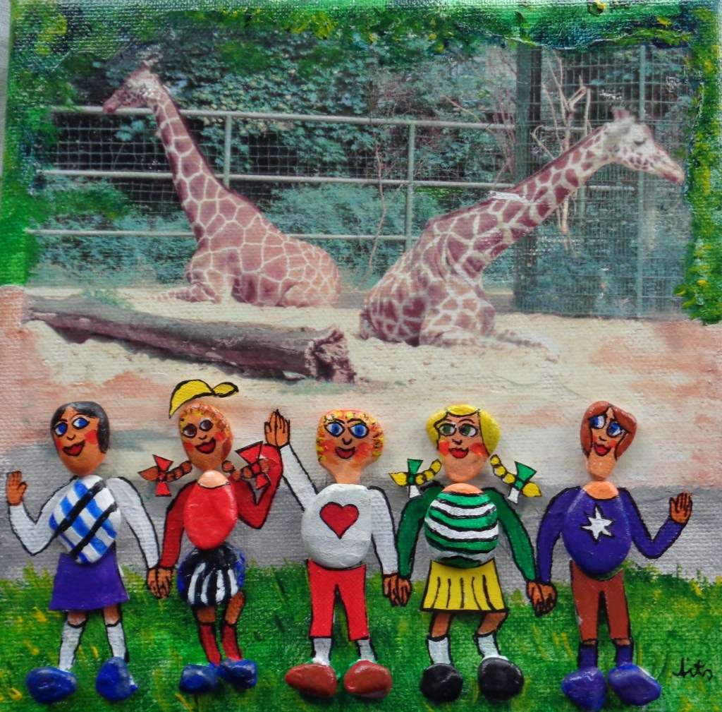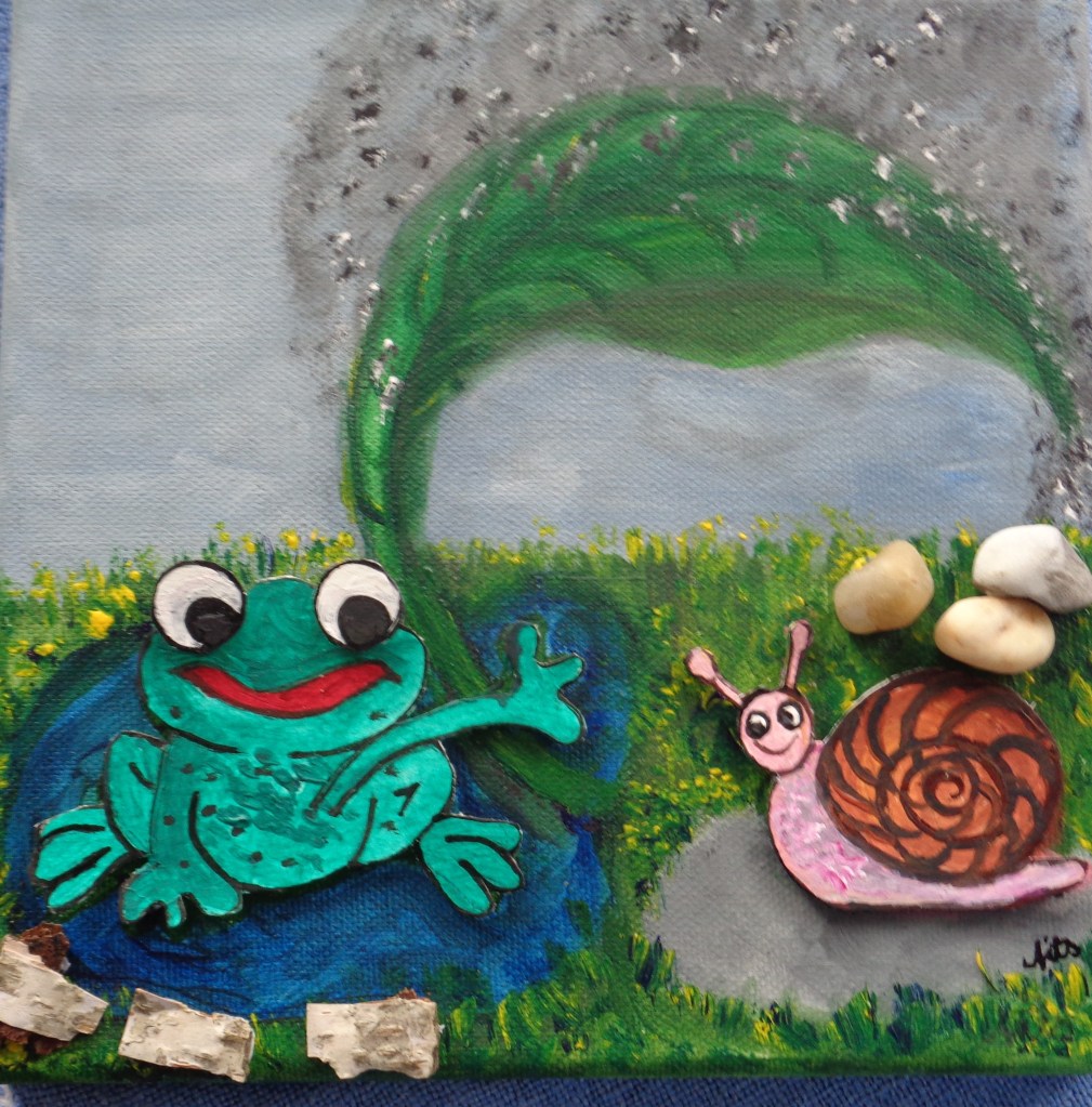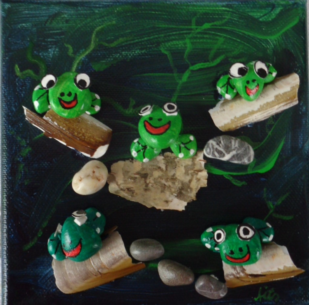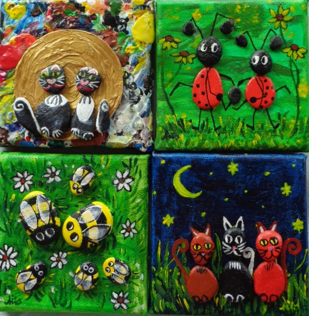 Küssende Fische 20×20 Acryl auf Leinwand, bemalte Rheinkiesel 45€ *Luftballon mit Effzeh Köln Acryl auf Leinwand 3D 20×20 *Krabbenkutter 40×40 160 €Eulenfamilie 20×20 40€*Tigershow 50×70 Acryl auf Leinwand 3D 250 € Eidechsen 20×20 Acryl auf Leinwand Mixed Media 49,- €